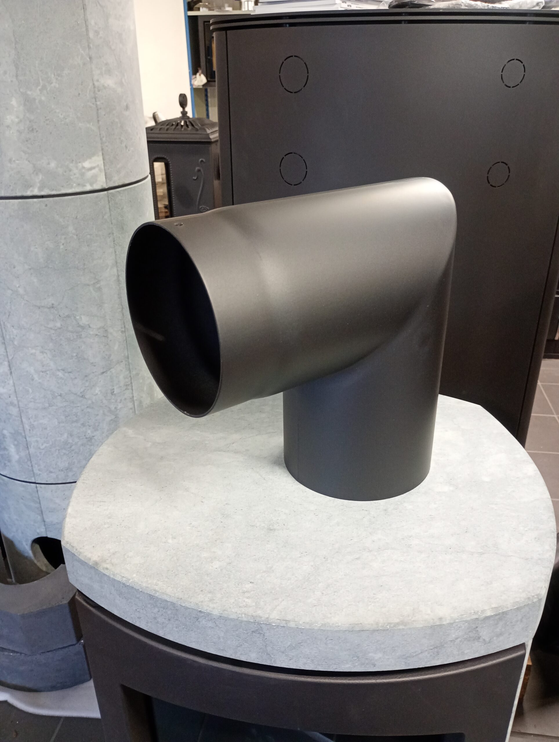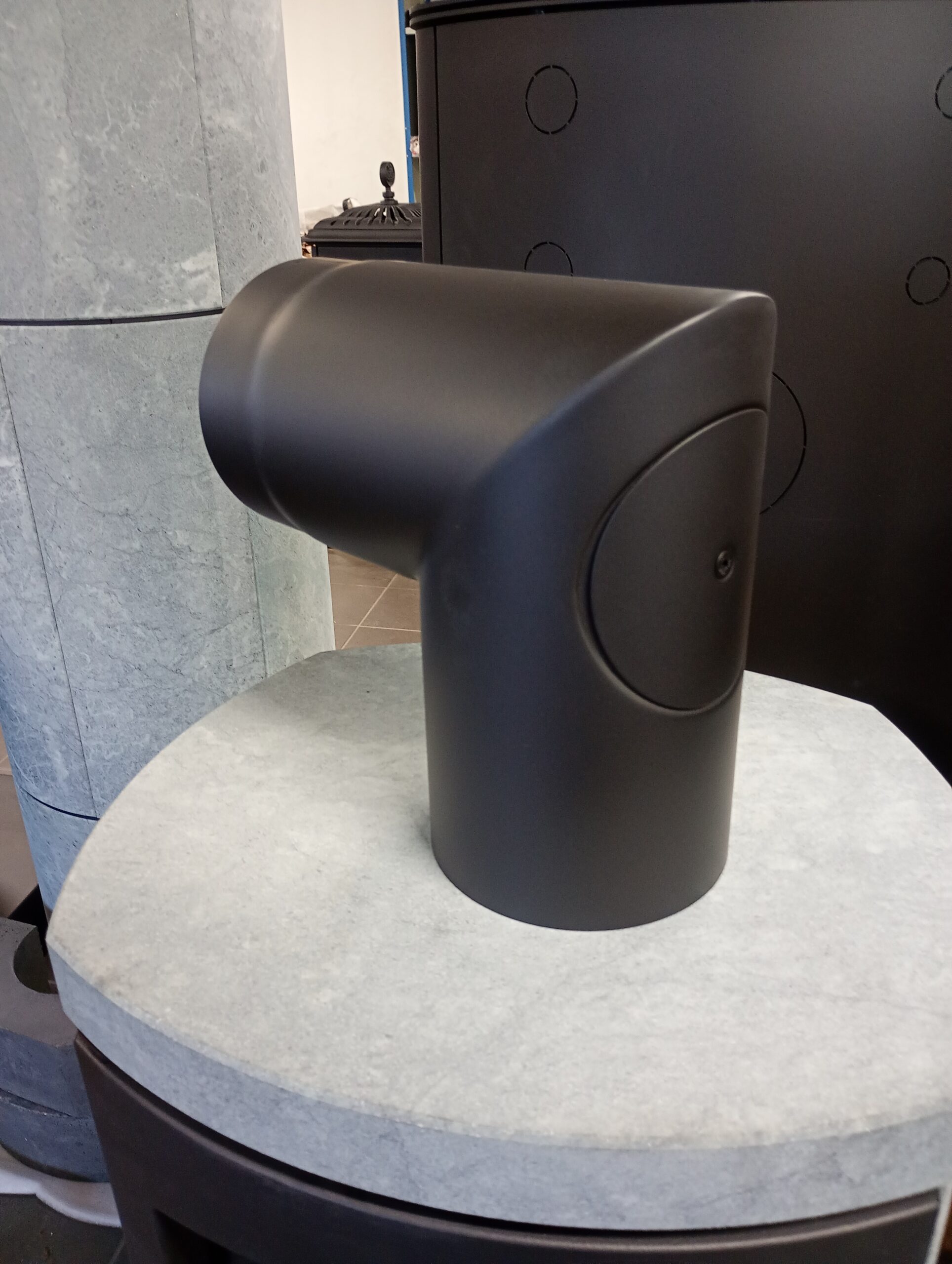 Rörböj med 90 graders vinkel för montering av skorstensrör, inklusive sotlucka. Denna variant har 150 mm i diameter.