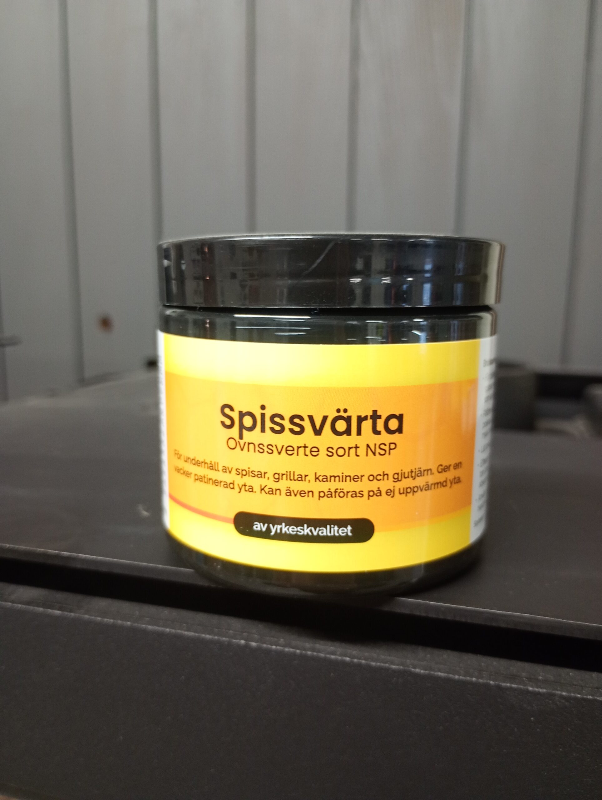 Spissvärta ger både skydd, underhåll och en vacker yta till spisen, kaminen, grillen och material i gjutjärn. Påstrykes med trasa, borste eller svamp. Vikt: 220 g.